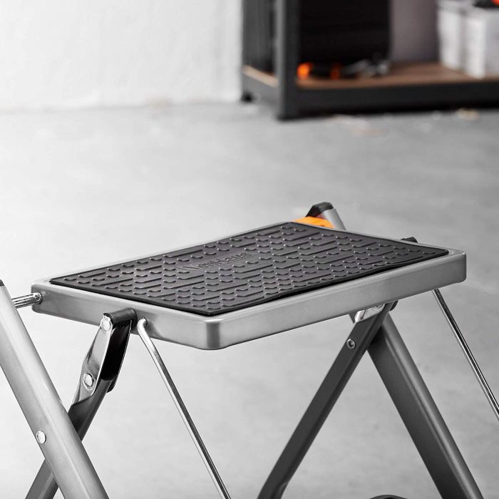 - Prenosna, jeklena lestev z dvema policama, ki se zloži v kompaktno velikost za lažje shranjevanje