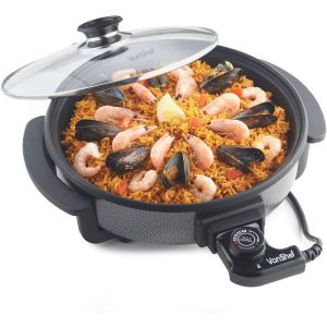 - VonShef električna ponev z 42cm velikim premerom in 5cm globine lahko kuha enolončnice, polne angleške zajtrke, riž, rižoto, fajitas, omlete, čili, pico, kotlete, palačinke, paeljo, krompirček – pustite domišljiji prosto pot!